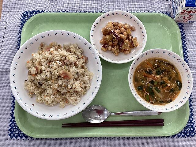 一覧へ 大豆とさつまいものミルクがらめ 日時 2026年02月02日(月) 公開対象 給食室 詳細 五目チャーハン タッケジャンスープ 大豆とさつまいものミルクがらめ 牛乳 ★今日は、大豆とさつまいもをカラッと揚げて、練乳で和えました。よく噛んで食べると ミルクの甘さ、豆の香ばしさ、さつまいもの自然な甘さがわかります。 作成者 柏第四中学校管理者 更新日時 2026-02-04 16:00:14