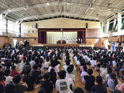 始業式では、校長先生から「まだまだ暑い日が続くことが予想されることから,まずは熱中症予防のため,登下校前に水分補給をしっかりと摂りましょう。その上で,『自分らしく』そして,みんなと助け合う2学期にしてください。」という話がありました。