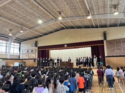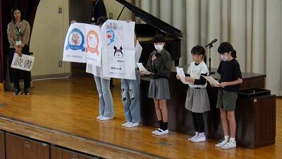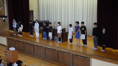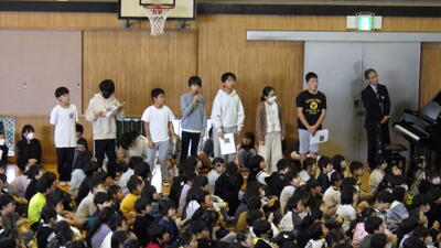 その後,児童会役員任命式を行いました。これまでの児童会役員と新しく選ばれた新児童会役員がそれぞれ,これまで頑張ってきたことやこれから頑張りたいことを堂々と話しました。新児童会役員は,良い伝統を受け継ぎ,さらに良い学校にするという強い決意が感じられました。ぜひ,頑張っていくことを期待します。