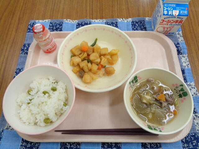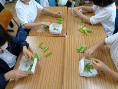 給食の「ピースごはん」に使う、グリンピースのさやとりを、2年生の子ども達がお手伝いをしながら体験しました。