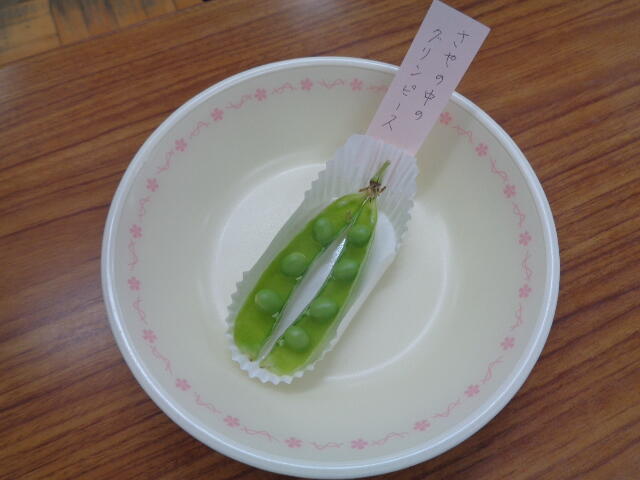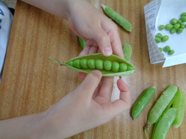 さやの中の豆を見て「きれい~。」と声をあげたり、「先生、見て見て!8個も並んでる。」と嬉しそうな