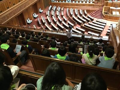 国会議事堂の見学が終わり,模擬国会を行い,学年の代表者がそれぞれの役を演じ,法律を決める際の質疑や採決を行いました。