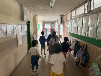 暑さが心配されましたが,午前中は曇り空が広がり,体調を崩すことなく楽しんで活動することができました。学校に戻ってきてからは,公園探検で見つけたことを振り返っていました。