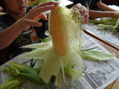 とうもろこしが皮付きのまま 農家さんから届きましたので、3年生となかよし・なのはな学級