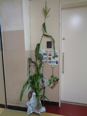 背の高い根付きのままのとうもろこしは、給食時間に全クラス、見ることができました。