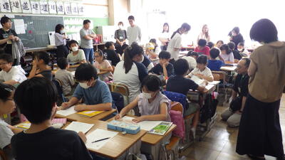 今泉先生は,楽しい雰囲気の中,子どもたちの思いを受け止めながら,アドバイスをしたり,良い所を認め,褒めたりして指導してくださいました。最初は悩んでいた子もいましたが,今泉先生の声かけや友だちとの関わりの中で,創造性豊かなすばらしい文字がたくさん生まれました。改めて子どもたちのイメージする力には,驚かされました。