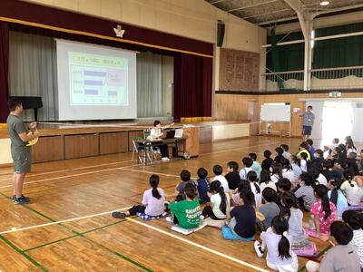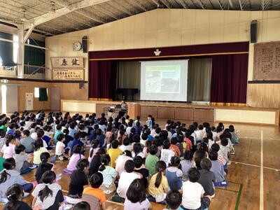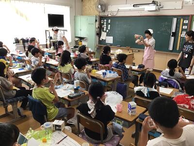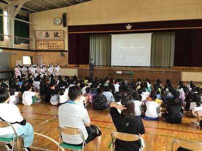 本日【7月3日(水)】,4年生を対象にした歯科保健指導が行われました。学校歯科医の田中先生をはじめ,たくさんの歯科衛生士の方々が来てくださり,歯の健康について教えていただきました。歯の健康は,体の健康にも大きく関わってくることがよくわかったと思います。その後は,各教室で歯の染め出しを行いました。持参した鏡で,磨きにくい箇所や汚れの付き具合を確認しました。また,正しいブラッシングの仕方についても丁寧に教えていただきました。