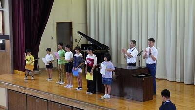 全校朝会前の表彰式では,書き初めや夏休みに取り組んだ成果などについて校長先生から表彰してもらいました。