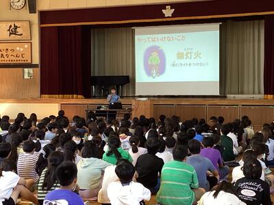 校長先生からは,火災の時に発生する煙の怖さについてや日頃から放送等をしっかり聞く準備の大切さについて話がありました。