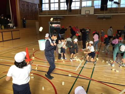 レク走では,先生とじゃんけんをして,結果によって10まで数えてハイタッチをしたり,マットの上で前転をしたりします。また,団体競技では,先生の背負ったかごに紅白の玉を入れる追いかけ玉入れや綱引き,長縄跳びなどに取り組みました。