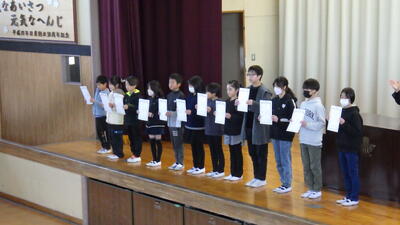 その後,児童会役員任命式を行いました。これまでの児童会役員と新しく選ばれた新児童会役員がそれぞれ,これまで頑張ってきたことやこれから頑張りたいことを堂々と話しました。新児童会役員は,良い伝統を受け継ぎ,さらに良い学校にするという強い決意が感じられました。ぜひ,頑張っていくことを期待します。