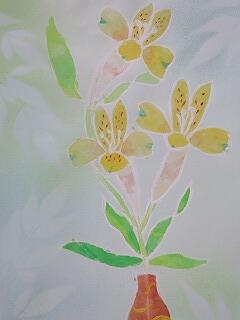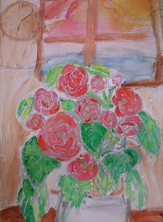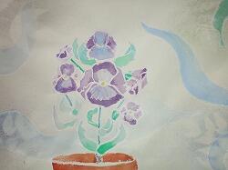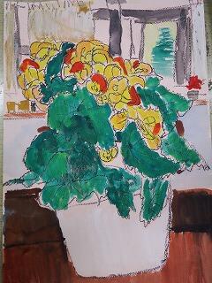 春に学校にある鉢植えの花や、切り花をスケッチして、春らしく背景を入れて仕上げました。