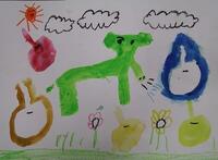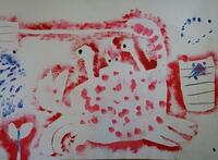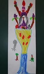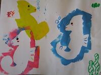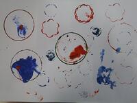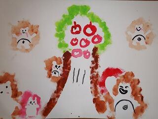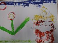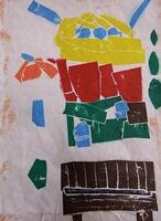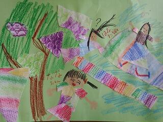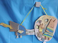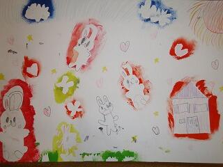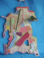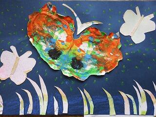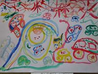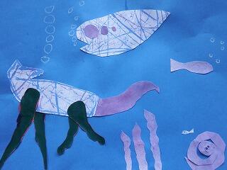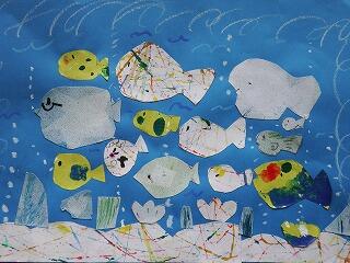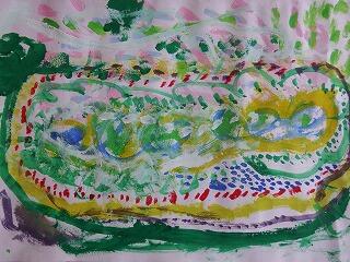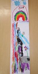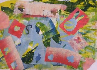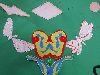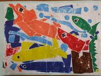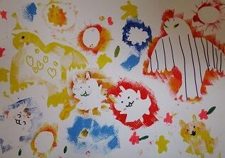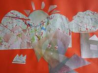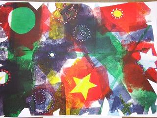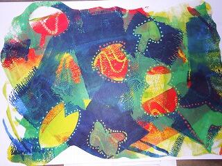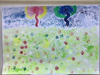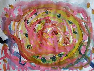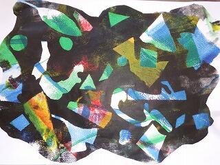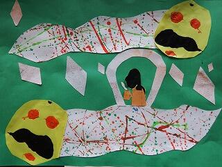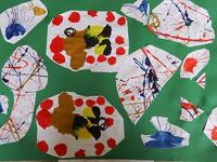 身の回りの道具を使って、絵の具遊びをしたあと、その用紙から想像をひろげ、作品づくりをしました。