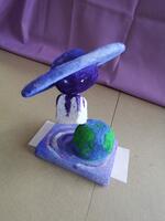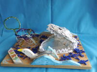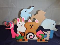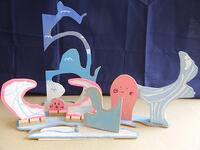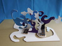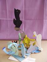 電動糸のこぎりの使い方に慣れる学習です。いろいろと寄り道をしながら曲線のピースを作っていきます。そのピースを組み合わせて、思いつく立体作品をつくりました。