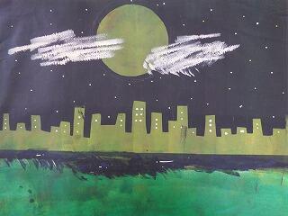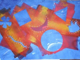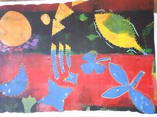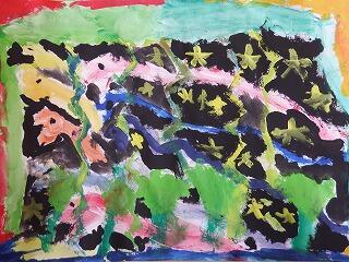 身の回りのいろいろなものを使って,絵の具遊びをしました。遊んでできた作品を生かして、さらに作品をつくりました。