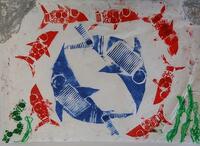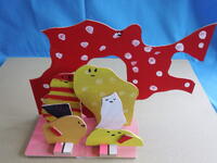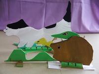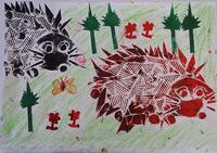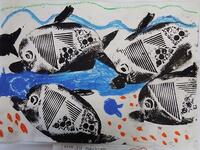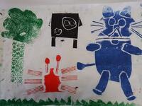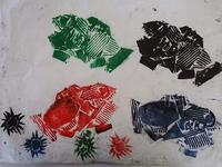 厚紙で生き物の部品を作って貼り合わせ、インクをつけて刷る紙版画の作品です。インクをペタンコにするのがコツです。