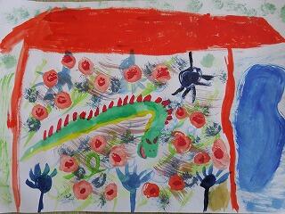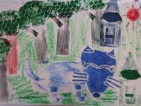 ローラーの使い方を工夫して,線や模様を描き,そこから作品を想像して,付け加え仕上げました。