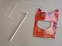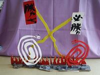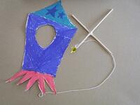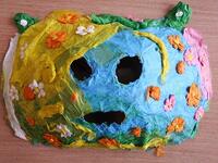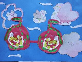 おめんやぼうしのかたを作り、お花紙にのりをつけて、重ねてはりました。