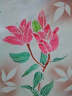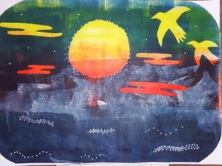 カラー用紙を台紙にはり、水で濡らした和紙をかぶせてインクをつける版画です。