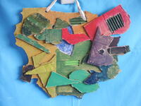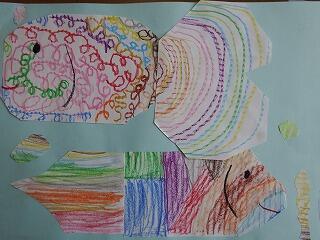 クレヨンを使って、でこぼこをうつしとり、その紙を生かして、形を切ってはり絵をしました。