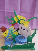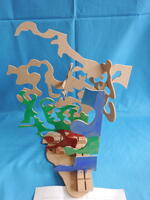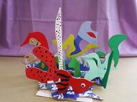 板の上を探検するように、糸のこぎりで切りすすめ、切った木を組み合わせて作品にしました。