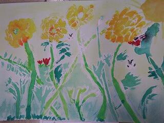 絵の具と水を合わせ,いろいろな色を使い,自由に描いてみました。水の量を変えたり,筆の使い方を工夫したりして描きました。