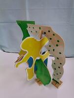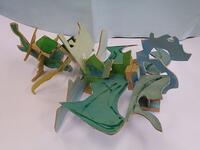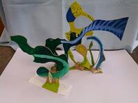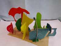 板の上を探検するように、糸のこぎりで切りすすめ、切った木を組み合わせて作品にしました。