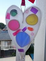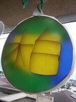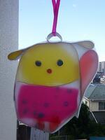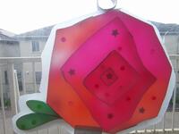 ダンボール紙で形の土台を作り,光を通す材料で色の組み合わせを工夫して,窓飾りを作りました。