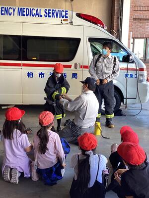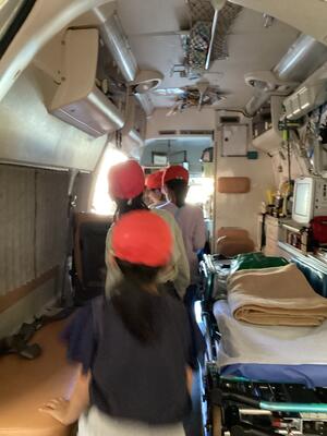 消防車や救急車を見たり,防火服を着させてもらったり,建物の中を見させてもらったりしました。消防署の方々にたくさん話を聞かせてもらい,消防署で働く人々の工夫や努力を知り,充実した時間となりました。今後の社会科の学習でさらに深めていきたいと思います。