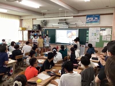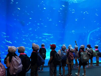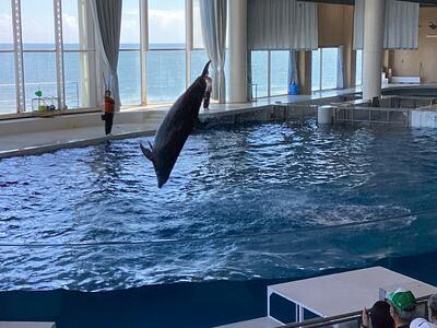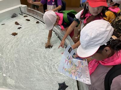 天気にも恵まれ,イルカショーでは,アシカのかわいらしい動きやイルカの迫力あるジャンプを見ました。お昼に美味しいお弁当を食べた後は,グループで協力し合いながら水族館内を見学しました。お気に入りの魚や興味のある生き物を見ることができて,子どもたちも大興奮でした。