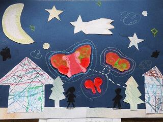 身の回りの道具を使って、絵の具遊びをしたあと、その用紙から想像をひろげ、作品づくりをしました。