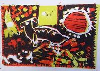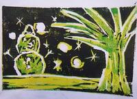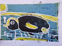 厚紙で生き物の部品を作って貼り合わせ、インクをつけて刷る紙版画の作品です。インクをペタンコにするのがコツです。