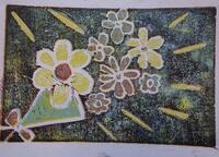 スタンプスタンプでは、身の回りにある材料を使って、形を工夫してスタンプしました。「こころのはなをさかせよう」では、一年生全員の花を、6年生を送る会で、体育館に飾りました。