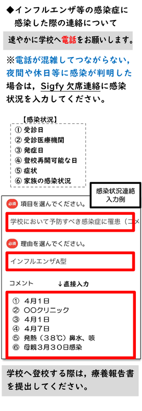 連絡① sifgy[シグフィ―](SNS連絡システム)を使って欠席・遅刻等の連絡をお願いします。