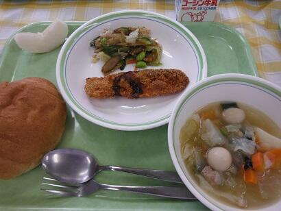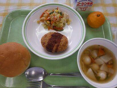 牛乳・丸パン・手作りコロッケ・コーンサラダ・かぶのスープ・みかん