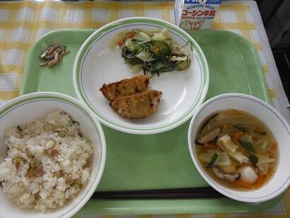 牛乳・野沢菜チャーハン・揚げぎょうざ・すき昆布サラダ・春雨スープ・アーモンド小魚