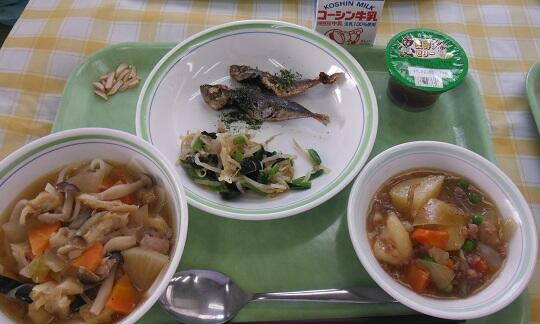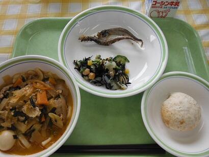 牛乳・白飯・さけのちゃんちゃん焼き・切干大根の旨煮・のっぺい汁・りんご・煎り大豆
