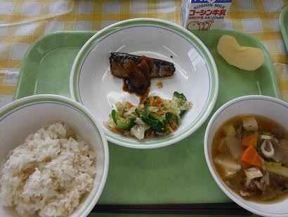 牛乳・白飯・いわしの甘露煮・キャベツときゅうりの梅肉あえ・豚汁・りんご