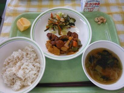 牛乳・白飯・酢豚・茎わかめのサラダ・ワンタンスープ・柿・炒りカシューナッツ