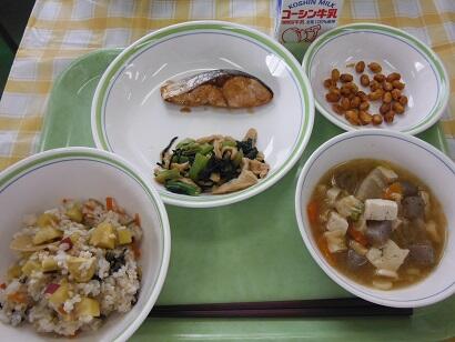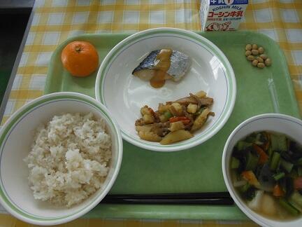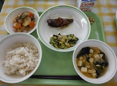 牛乳・秋の香りごはん・イナダの照り焼き・小松菜の煮びたし・味噌けんちん汁・スパイシー大豆