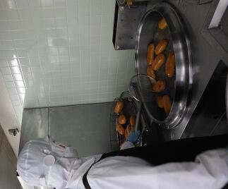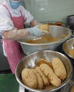 また、今日は鶏挽き肉と豚挽き肉を使って松風焼きも作りました。松風焼きは、お正月に食べるおせち料理のひとつです。「松風焼き」の「松風」とは、ケシの実やゴマを表面にふりかけて焼いたもののことを言います。昔は保存をよくするため、肉のみで作られていましたが、最近はいろいろな食感や味を楽しむために、野菜を加えたものが多くなっています。給食では、卵・玉ねぎ・人参・しょうがを入れて、つなぎにパン粉を入れてよくこねて作りました。味噌の香りがよく、御飯によくあう味でした。