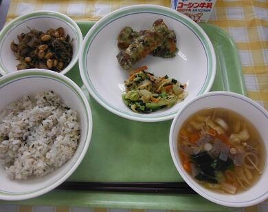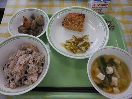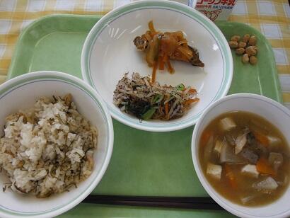 牛乳・ひじきと青大豆のごはん・あじのさんが焼き・ちんげん菜のごまあえ・かぶの味噌汁・炒りアーモンド