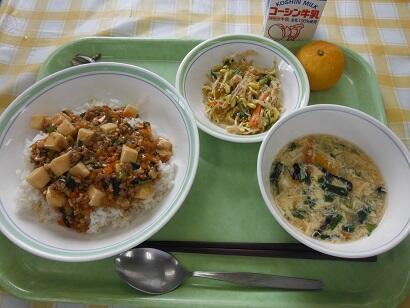 牛乳・マーボー豆腐丼・ナムル・にらたまスープ・みかん・小魚