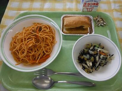 牛乳・スパゲティミートソース・キャベツとベーコンのスープ・スウィートポテトの春巻き揚げ・小魚