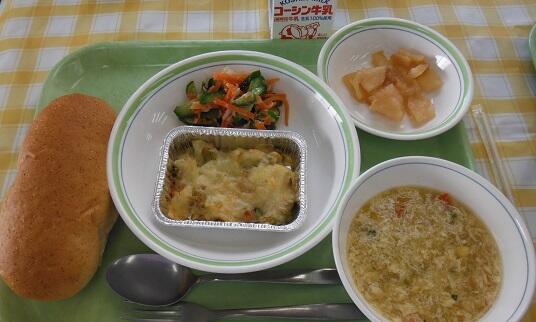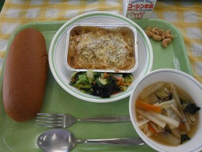 牛乳・はちみつパン・マカロニグラタン・大根とツナのサラダ・白菜とベーコンのスープ・大豆小魚