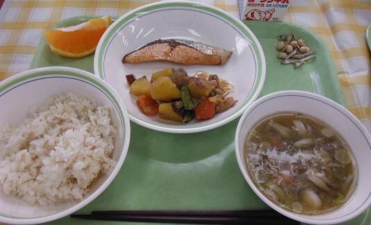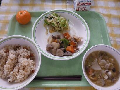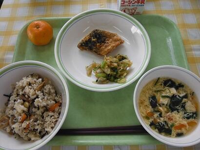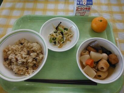 牛乳・さつま芋ごはん・いわしのかば焼き・かぶときゅうりのごま酢あえ・小松菜と油揚げの味噌汁・みかん