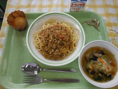 牛乳・スパゲティ大豆ソース・千切り野菜のスープ・米粉マフィン・小魚