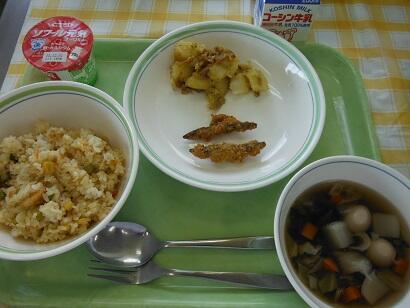 牛乳・エビピラフ・きびなごのごまフライ・ジャーマンポテト・レンズ豆と野菜のスープ・ヨーグルト