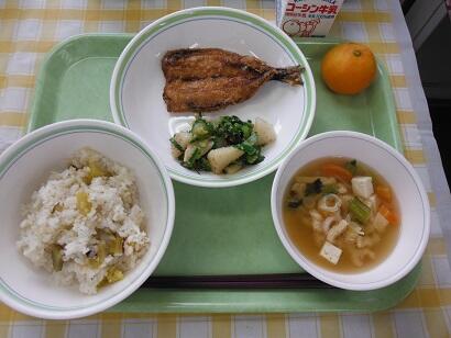 牛乳・菜の花ちらし・ししゃものごま天ぷら・磯香あえ・田舎汁・デコポン