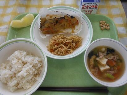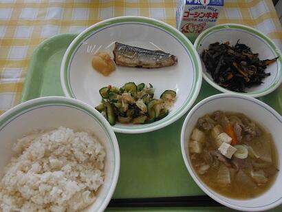 牛乳・白飯・さんまの塩焼き・大根おろし・きゅうりの土佐酢和え・大豆の磯煮・豚汁